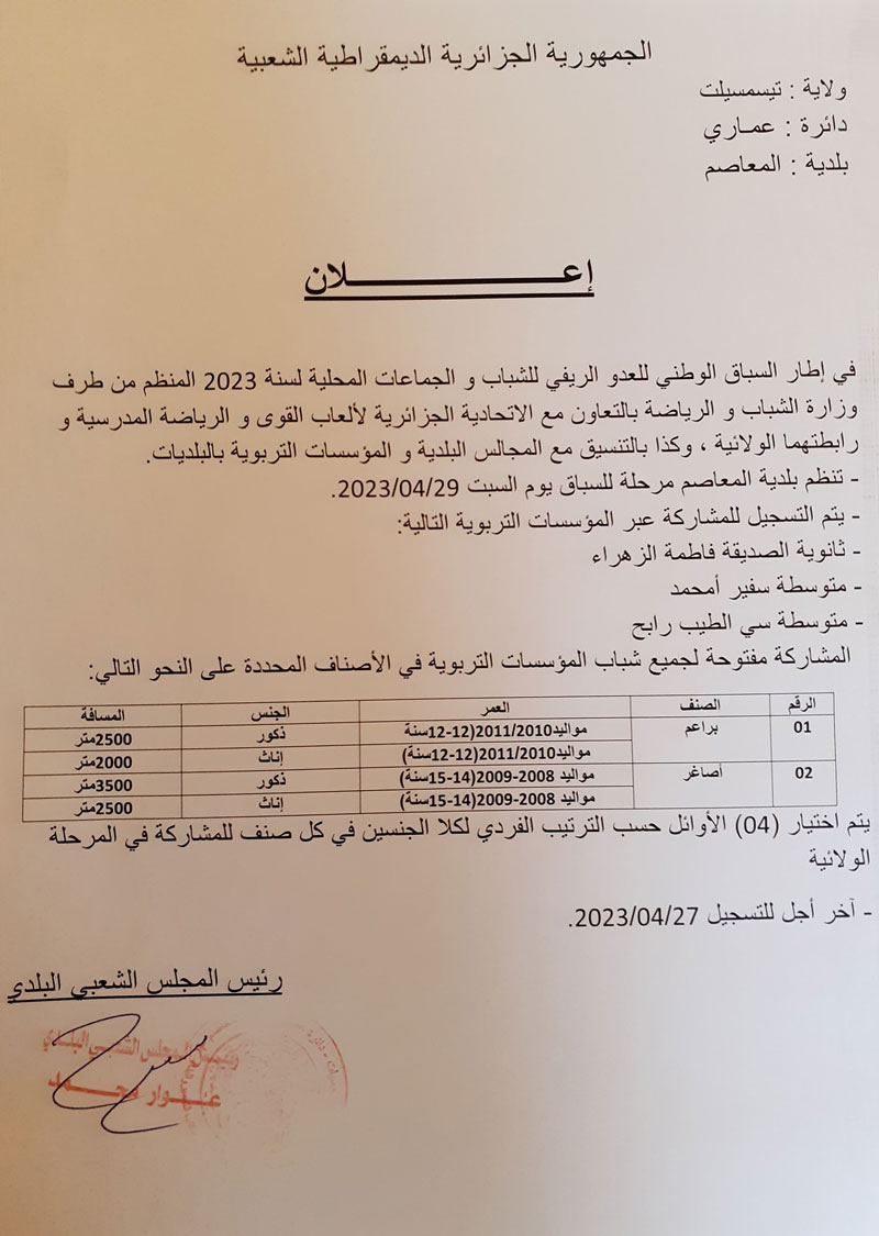 إعلان : السباق الوطني للعدو الريفي للشباب والجماعات المحلية لسنة 2023