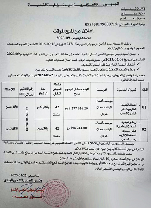 إعلان عن المنح المؤقت للاستشارة رقم 2023/09