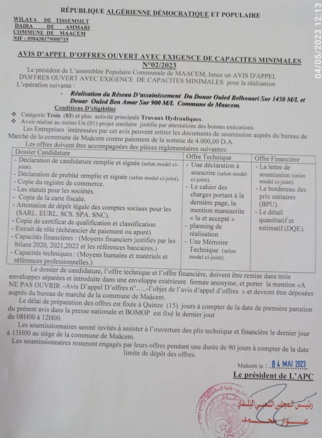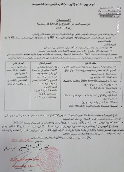 إعلان عن طلب العروض المفتوح مع إشتراط قدرات دنيا رقم 2023/02