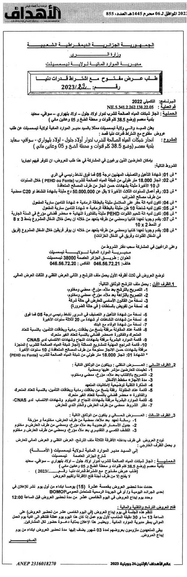 إعلان عن طلب عرض مفتوح مع اشتراط قدرات دنيا رقم 2023/22